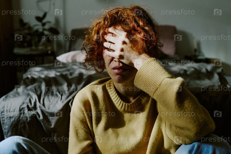 Сидеть в постели, покрывая лицо рукой в интимной обстановке