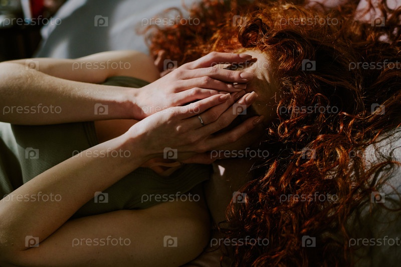 Женщина, страдающая от скорби, покрывает лицо на кровати