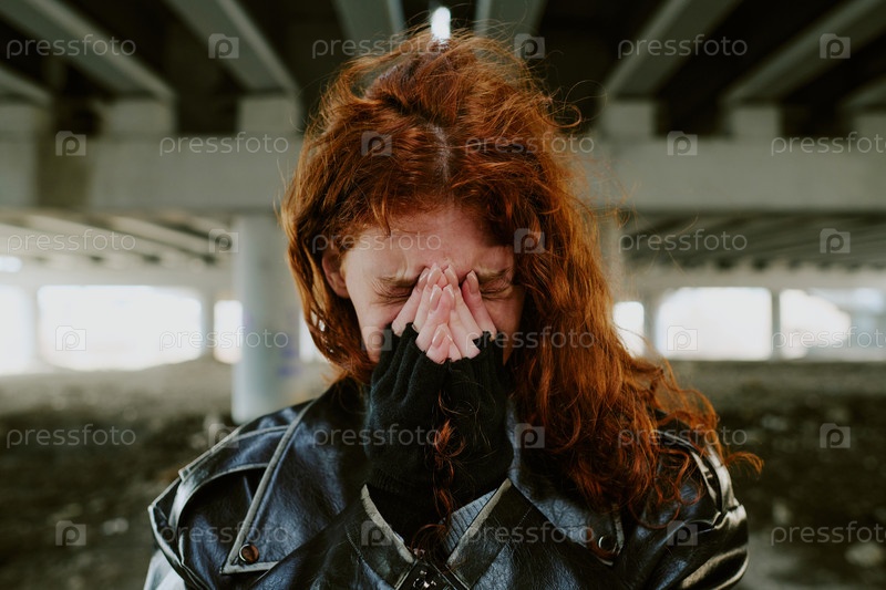 Сидя под мостом, скрывая лицо и показывая эмоции