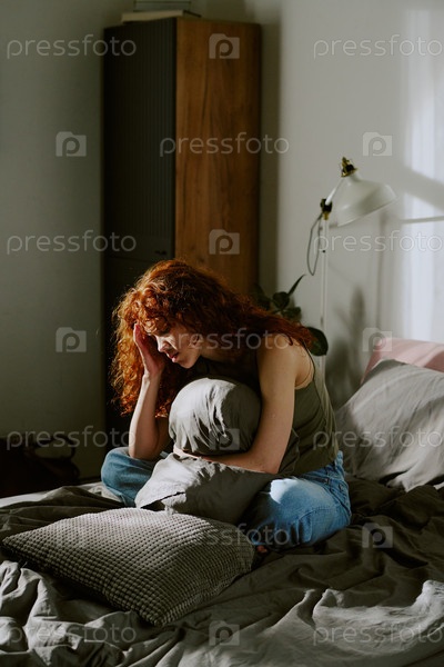 Женщина сидит на кровати, держащая подушку в спальне