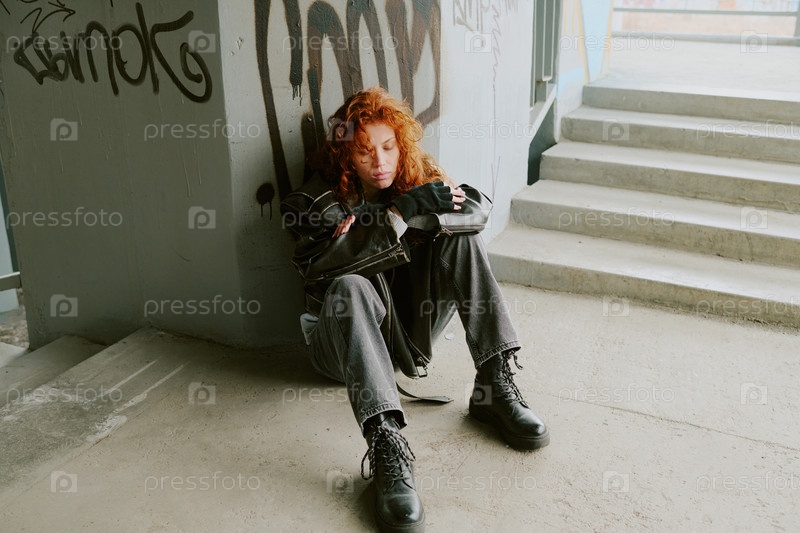 Расслабление на лестнице в городской обстановке с фоном граффити