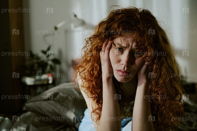 Депрессивная женщина с кудрявыми волосами сидит в помещении