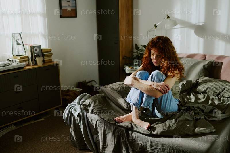 Созерцание женщины, сидящей на кровати в солнечной комнате