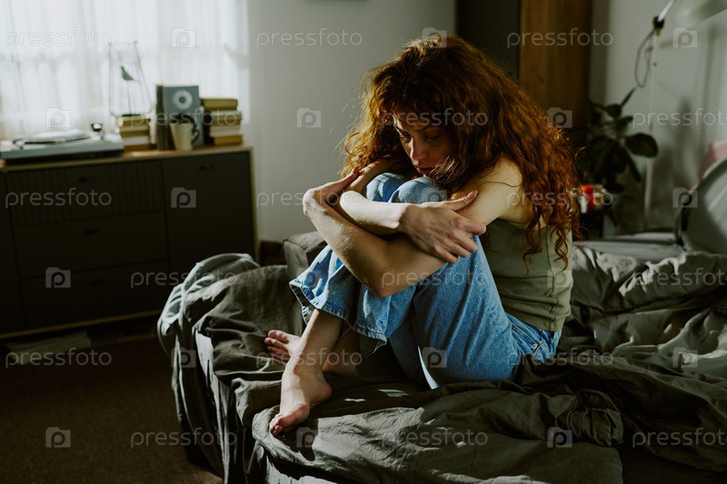 Молодая женщина сидит на кровати в созерцательном настроении