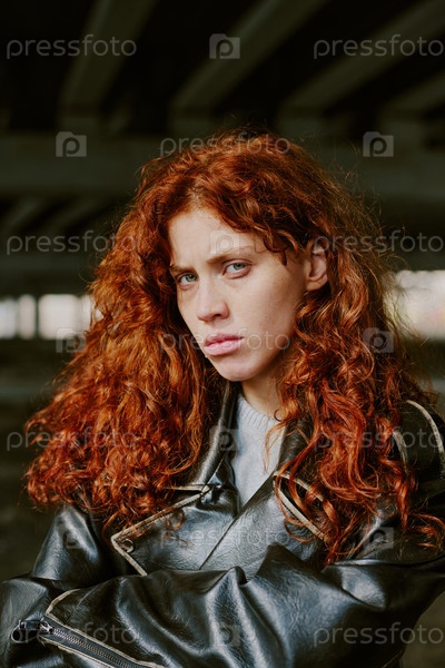 Портрет красноволосой женщины, одетой в кожаную куртку