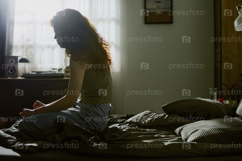 Задумчивая женщина, сидящая на спальной кровати в естественном свете
