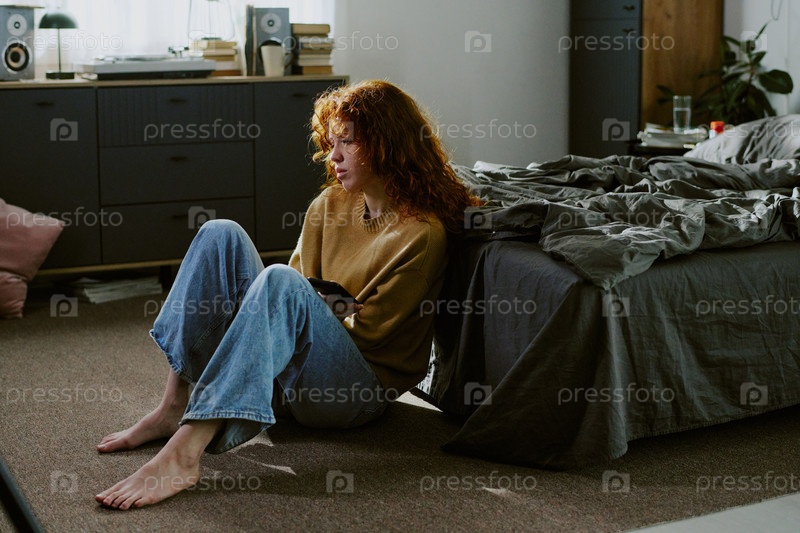 Отражение женщины, сидящей на полу в спальне рядом с кроватью