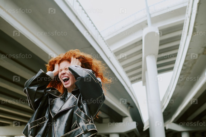 Красноволосая женщина кричит под городским мостом в кожаной куртке