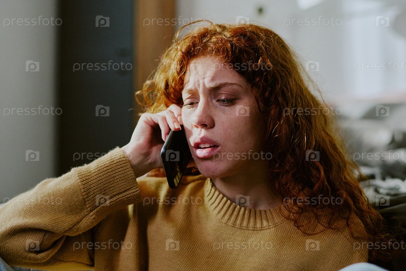 Портрет обеспокоенной женщины, разговаривающей со смартфоном в помещении