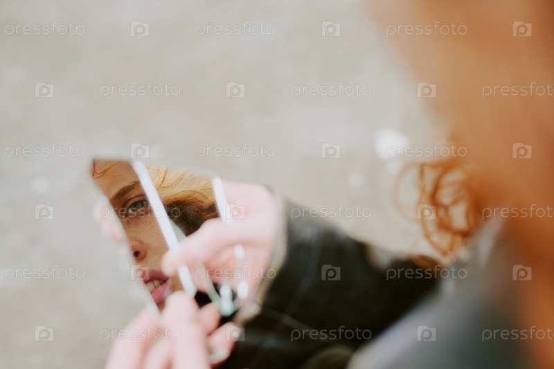 Отраженная женщина держит фрагмент разбитого зеркала