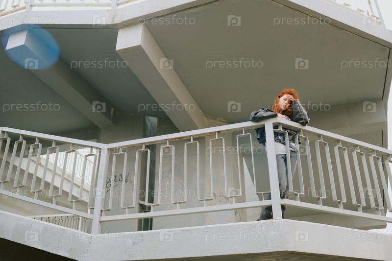 Стоя на бетонном балконе с геометрическими узорами