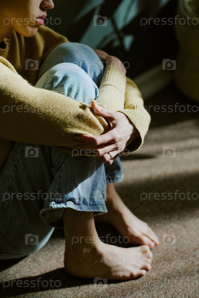 Женщина, сидящая одна и обнимающая колени во время глубокой мысли