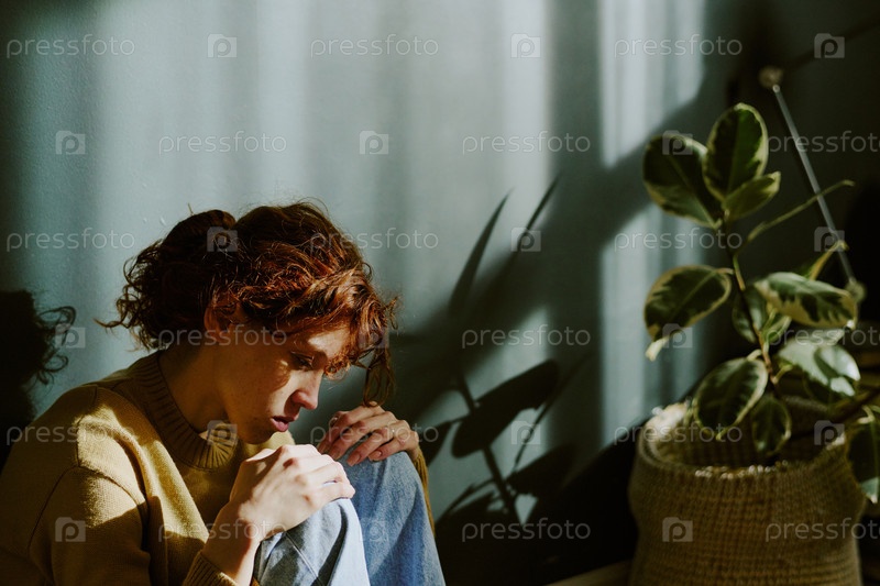 Созерцание женщины, сидящей рядом с комнатным растением в помещении