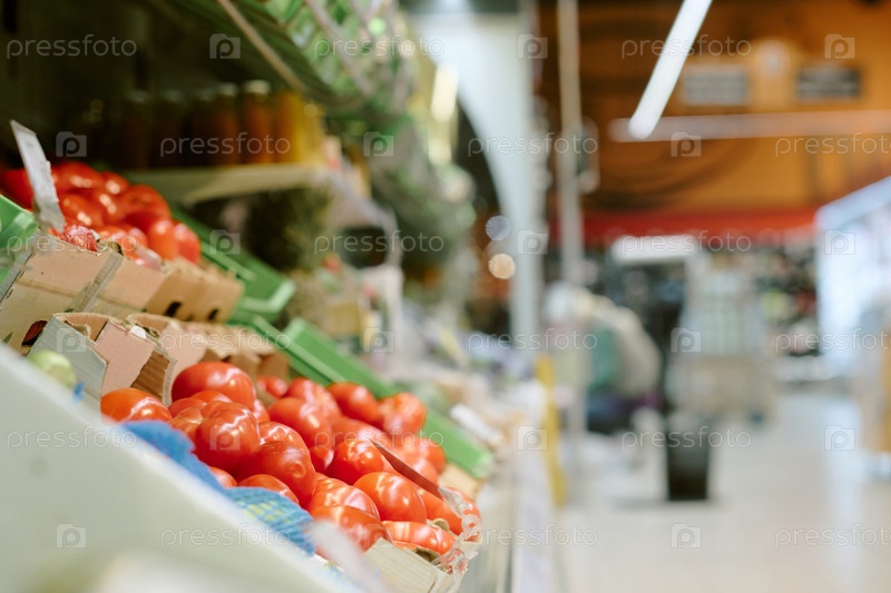 Свежие помидоры на выставке в продуктовом магазине Produce Section