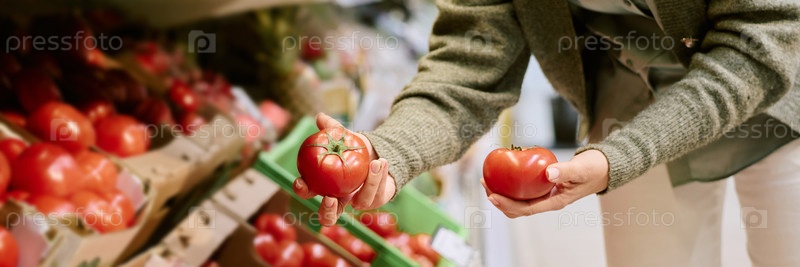 Заголовок сбора свежих помидоров в проходе продуктового магазина