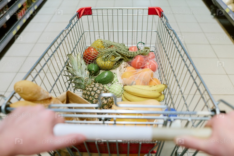 Торговая корзина заполнена свежими продуктами питания в супермаркете