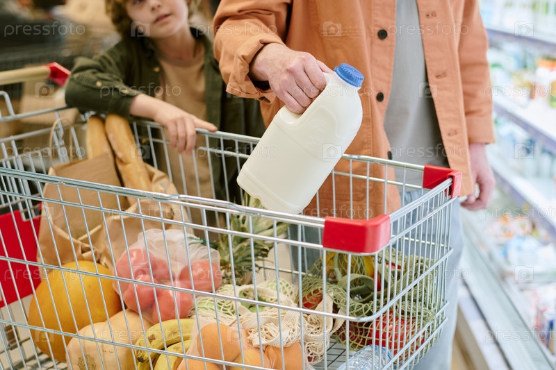 Покупка продуктов питания в супермаркете с помощью тележки