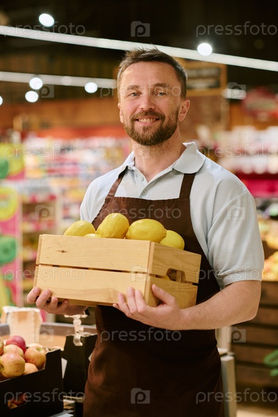 Улыбающийся продуктовый магазин, держащий деревянный ящик с свежими манго