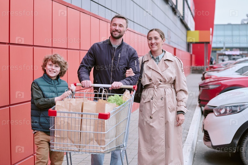 Семейные покупки вместе в открытом продуктовом магазине