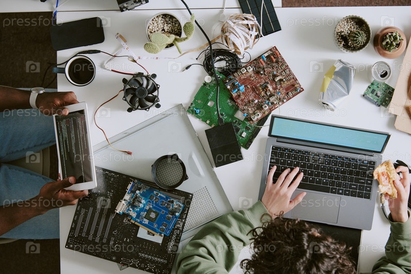 Сотрудничество над проектом по электронике с гаджетами на столе