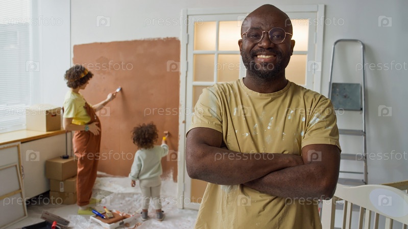 Портрет улыбающегося афроамериканца в комнате для ремонта