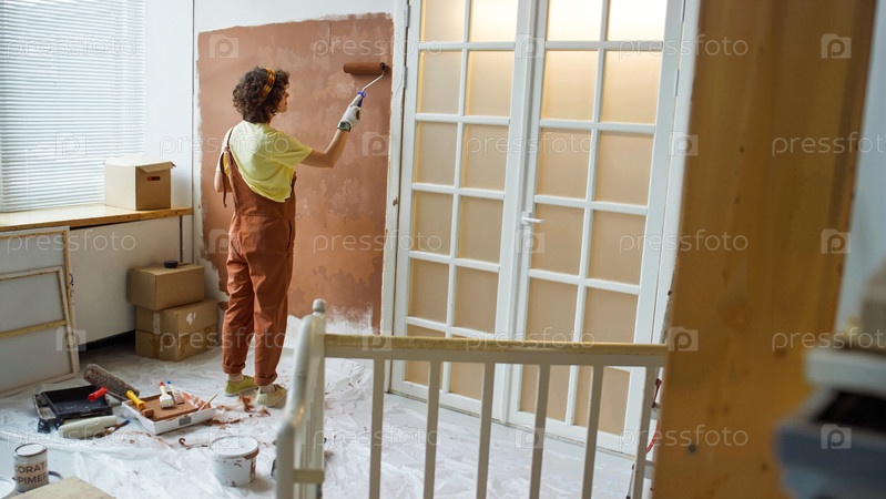 Женщина, рисующая стену с помощью роликовой кисти в уютной комнате