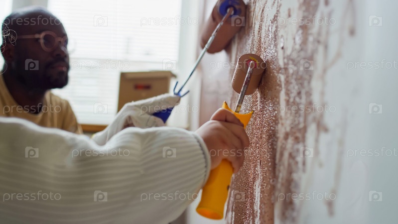 Процесс покраски стены с помощью ролика и наблюдения за партнером