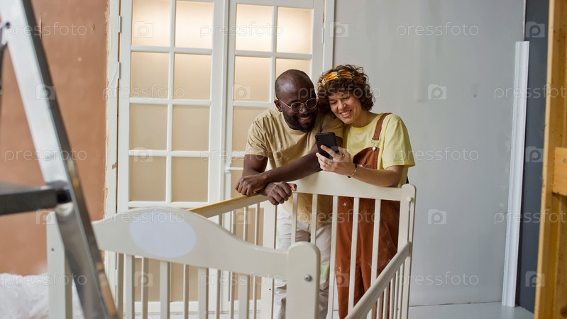 Пара осматривает кроватку с планшетом в светлой комнате