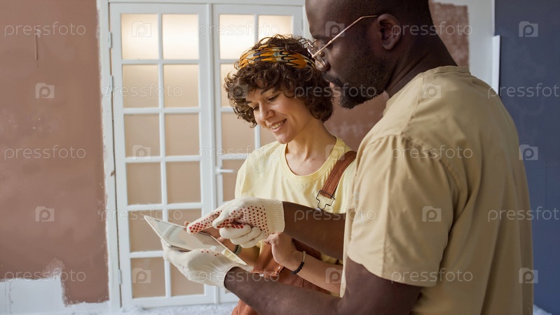 Улыбающаяся пара реконструирует дом, консультируясь с планшетом