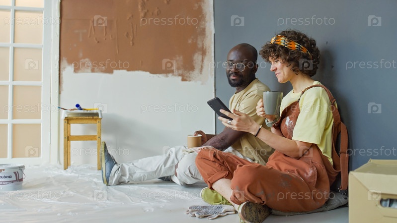Пара рисует гостиную и делает перерыв с планшетом