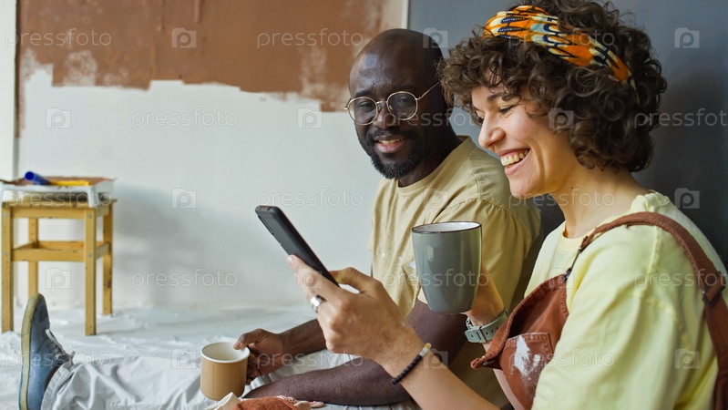 Улыбающаяся пара наслаждается кофе-брейком во время реконструкции