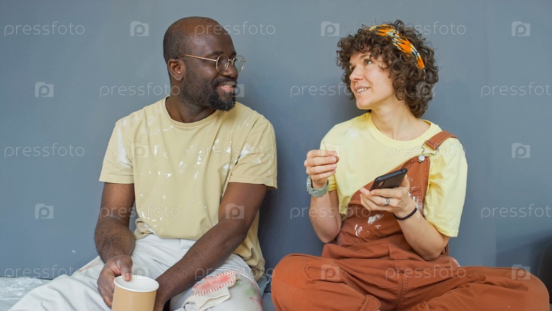 Улыбающиеся друзья ведут расслабляющую беседу за кофе