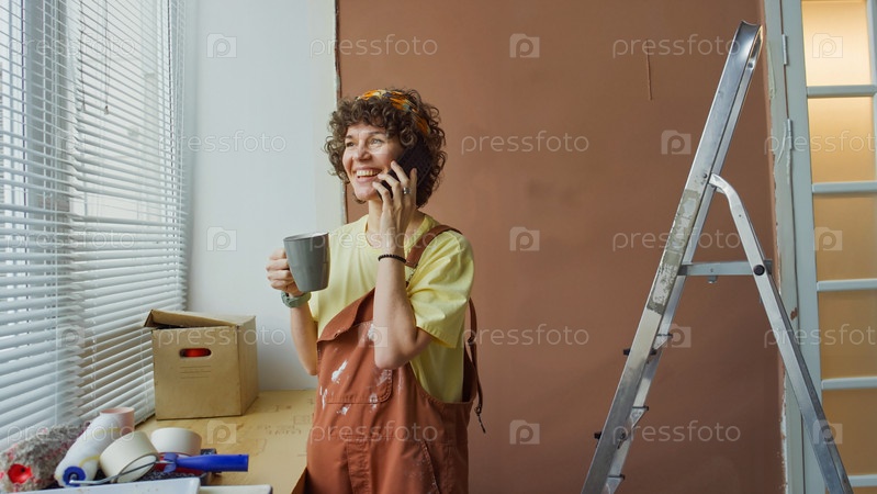Смеющаяся женщина в комбинезонах, держащая кружку и разговаривающую по телефону