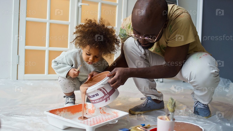 Отец-американец рисует со своим маленьким афроамериканским ребенком