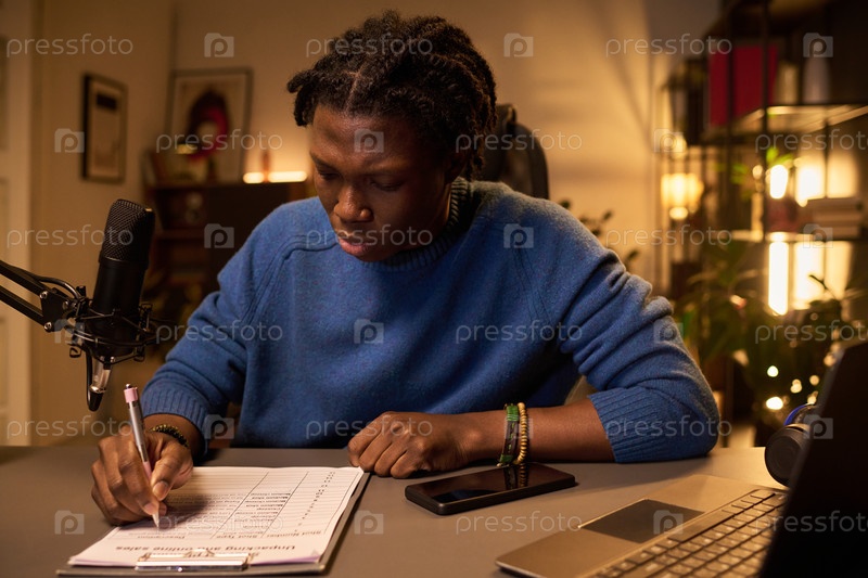 Фокусированный афроамериканский ведущий подкаста работает над планом