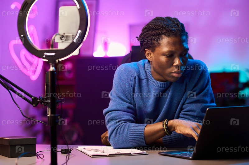 Африканский американец использует ноутбук в современной студии звукозаписи