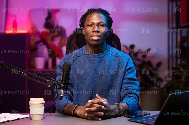 Портрет человека, сидящего в студии с микрофоном и ноутбуком