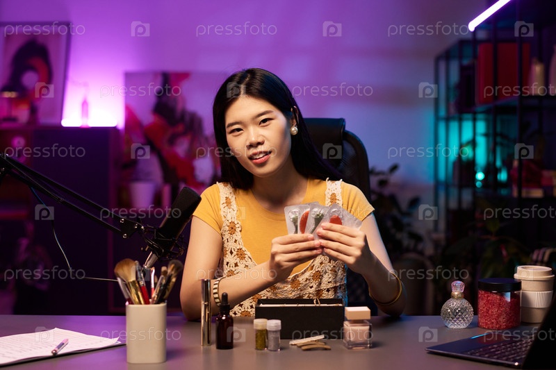 Портрет азиатской женщины, демонстрирующей продукты для макияжа