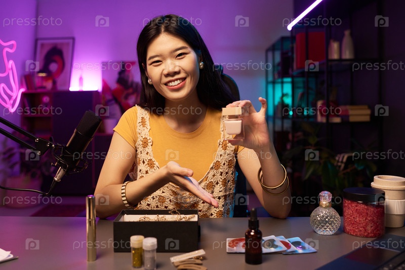 Улыбающаяся женщина участвует в демонстрации косметического продукта