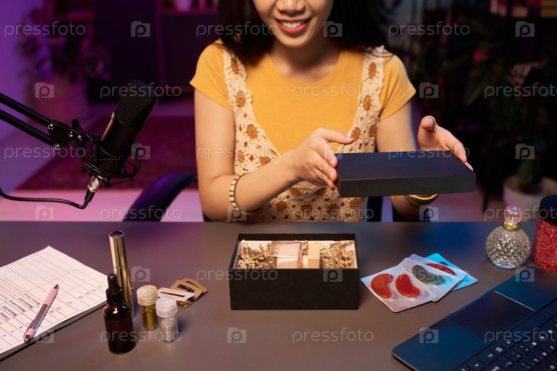 Женщина демонстрирует продукты красоты в домашней студии