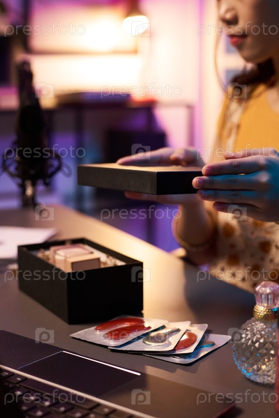 Женщина Unboxing Beauty Products живая в домашней студии