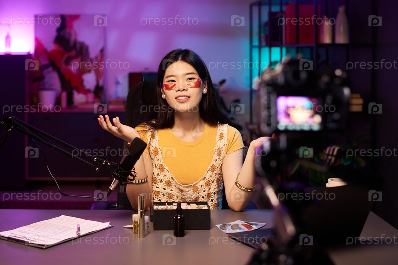 Азиатская женщина записывает красоту в блоге под студийным освещением