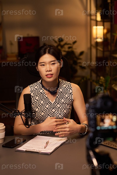 Портрет профессиональной азиатской женщины, ведущей подкаст