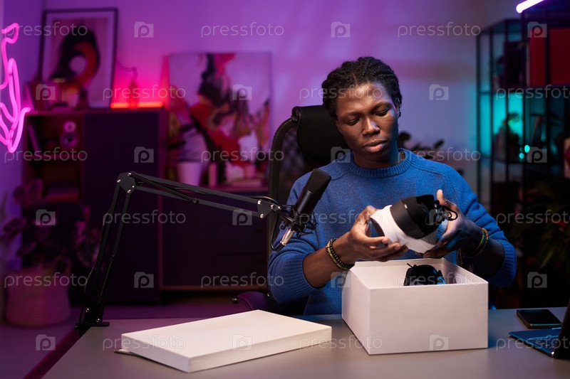 Портрет афроамериканского мужчины, использующего гарнитуру виртуальной реальности