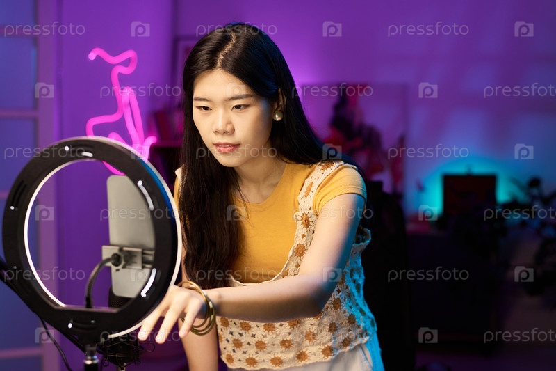 Молодая азиатская женщина использует кольцевое освещение со смартфоном для потоковой передачи