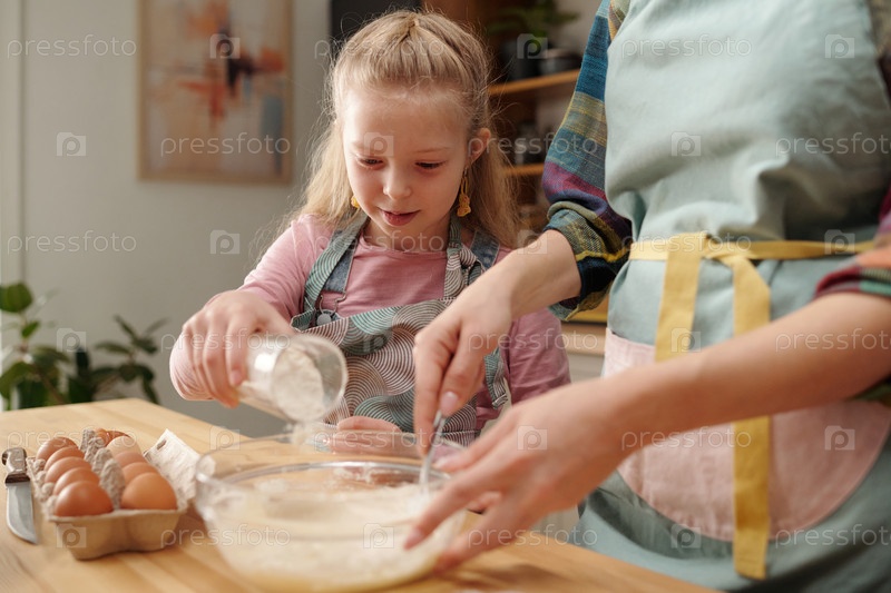 Молодая девушка печет под наблюдением взрослых на кухне