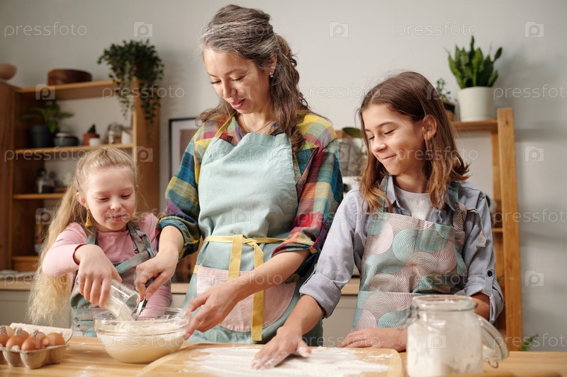 Мать и дочери пекутся вместе на уютной кухне