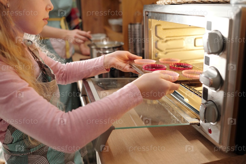 Маленькая девочка печет кексы с помощью бабушки и дедушки