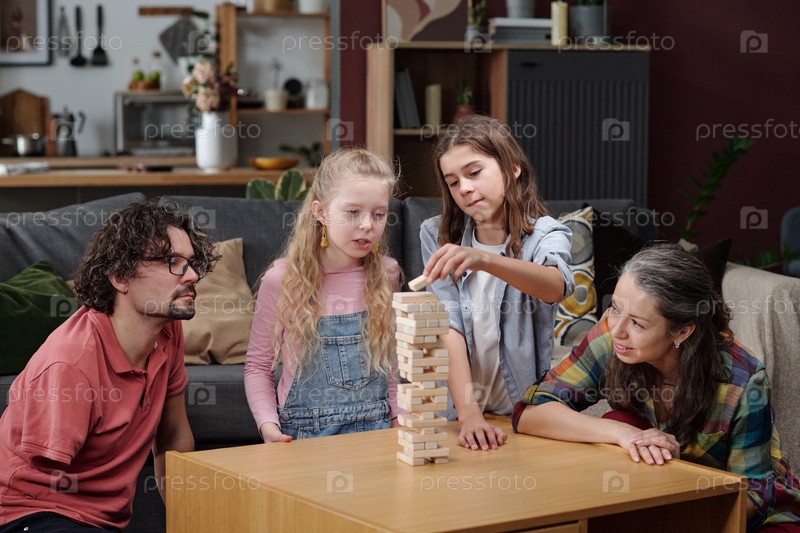 Семья наслаждается веселым игровым мероприятием в помещении на деревянном столе