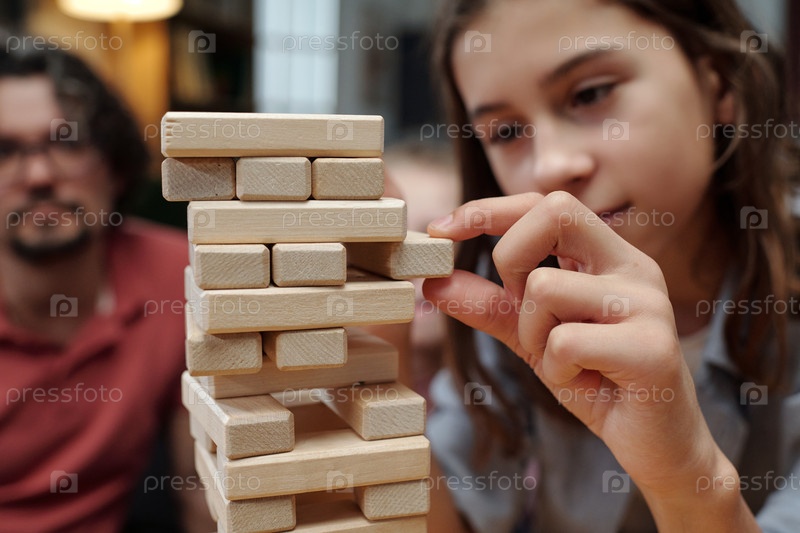 Играть в дженгу с семьей за столом гостиной